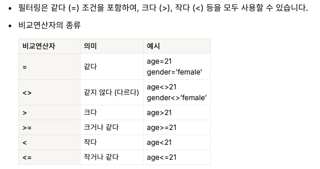 SQL의 WHERE 문법을 이용하면 전체 데이터 중 원하는 데이터만 필터링을 할 수 있다.