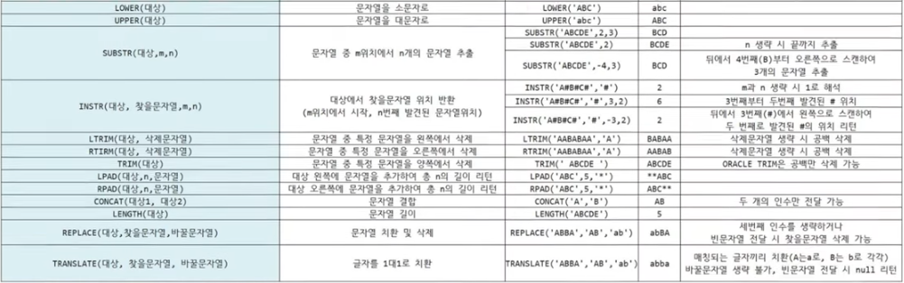 - 문자형 함수: 문자열 결합, 추출, 삭제 등을 수행. 단일행 함수 형태. output은 대부분 문자값.(LENGTH, INSTR 제외.)